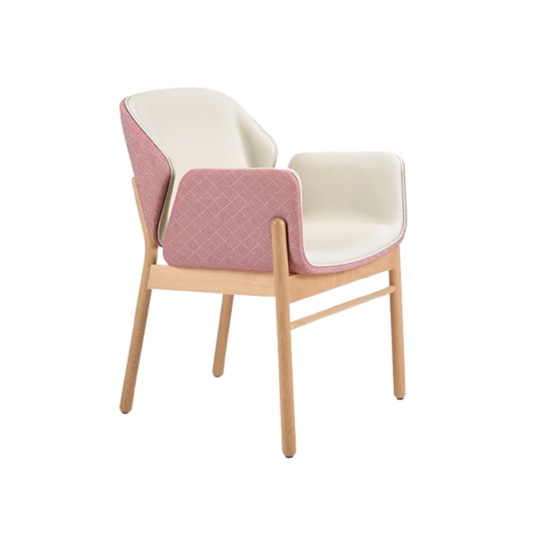 The Abbie A armchair combines style and comfort with a stained beech wood frame and a fully upholstered seat and back featuring two fabrics with piping (extra cost included) for a customizable touch. Ideal for restaurants, bistros, fast food venues, and waiting areas, it offers lasting comfort and elegant design.