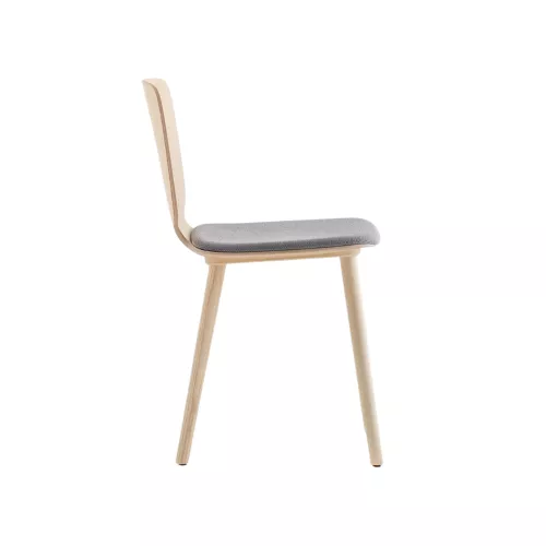 Chair featuring a curved ash plywood shell in variable thickness and solid ash wood legs for a warm, natural look. Available in a range of contemporary finishes: blue, azur, dark green, mint green, red, pink, dark brown, and brown. A stylish and comfortable choice for hospitality interiors.