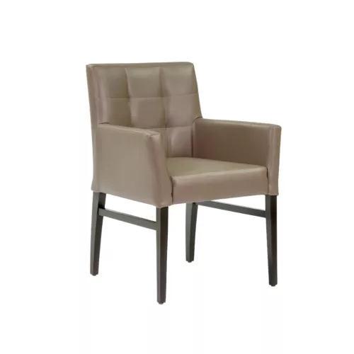 Bernard A Square Capitons is a refined wooden chair with armrests, designed for comfort and durability in horeca spaces. Featuring a solid beech wood frame available in multiple stain finishes, it includes decorative capitons stitching on the backrest and upholstery in professional fabrics or faux leather, suitable for high-traffic interiors.