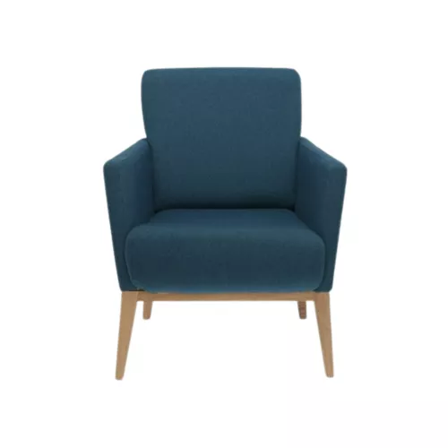 The Bowen armchair features sturdy beech wood legs and is fully upholstered on the seat, backrest, and armrests, ensuring maximum comfort. Customizable with a wide selection of professional fabrics or faux leather designed for intense use, plus multiple wood stain options. Perfect for lounges, lobbies, and various horeca settings, combining style and durability.