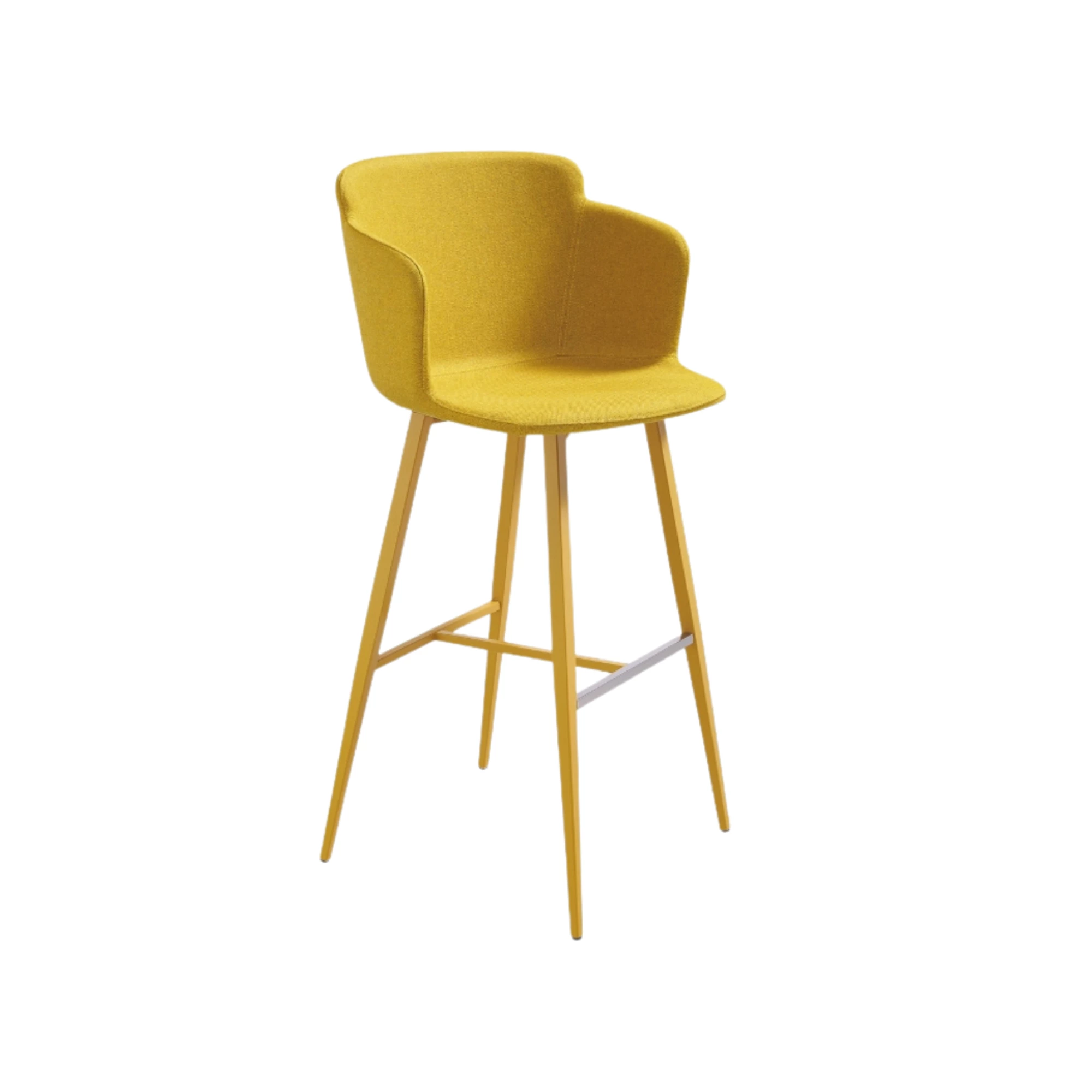 Elegant fixed barstool with armrests, featuring a sturdy four-legged metal base and an upholstered shell available in fabric, leather, or faux leather. The version with a plastic shell is suitable for outdoor use, offering great versatility for both indoor and terrace settings. Available in two heights – H65 and H75 – this barstool combines modern design, comfort, and durability, making it a perfect addition to stylish bars, cafés, and restaurants.