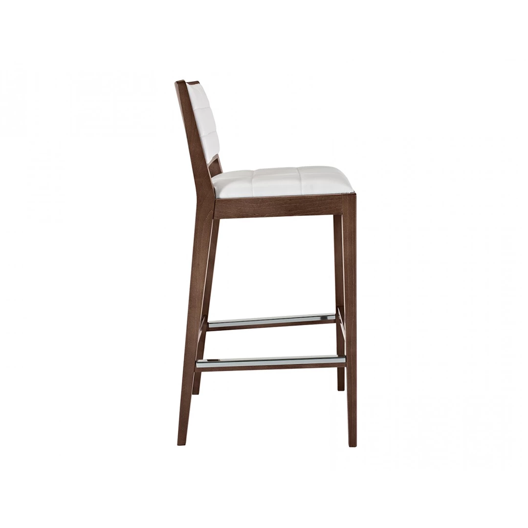 The Cassie 2 BK barstool blends timeless design with refined details. Crafted from beech wood, its frame is available in various stain finishes and features a wooden footrest with metal protection. The upholstered seat and backrest, accented with square stitch details, offer elegance and comfort—ideal for bars, event halls, and horeca venues.