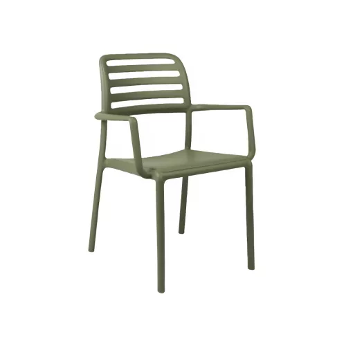 Costa is a sleek and modern outdoor chair with armrests, made from fiberglass polypropylene with UV additives. Its slatted backrest and seamless tubular frame offer style and comfort. Lightweight, stackable, and perfect for horeca terraces.