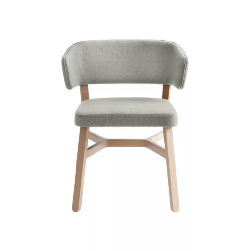 Croissant 571 is an elegant upholstered chair with a solid beech wood frame, designed for lasting comfort and visual appeal. The curved backrest offers ergonomic support, while the padded seat ensures a pleasant seating experience. Available in multiple wood stain finishes and a wide selection of professional fabrics for personalized upholstery.