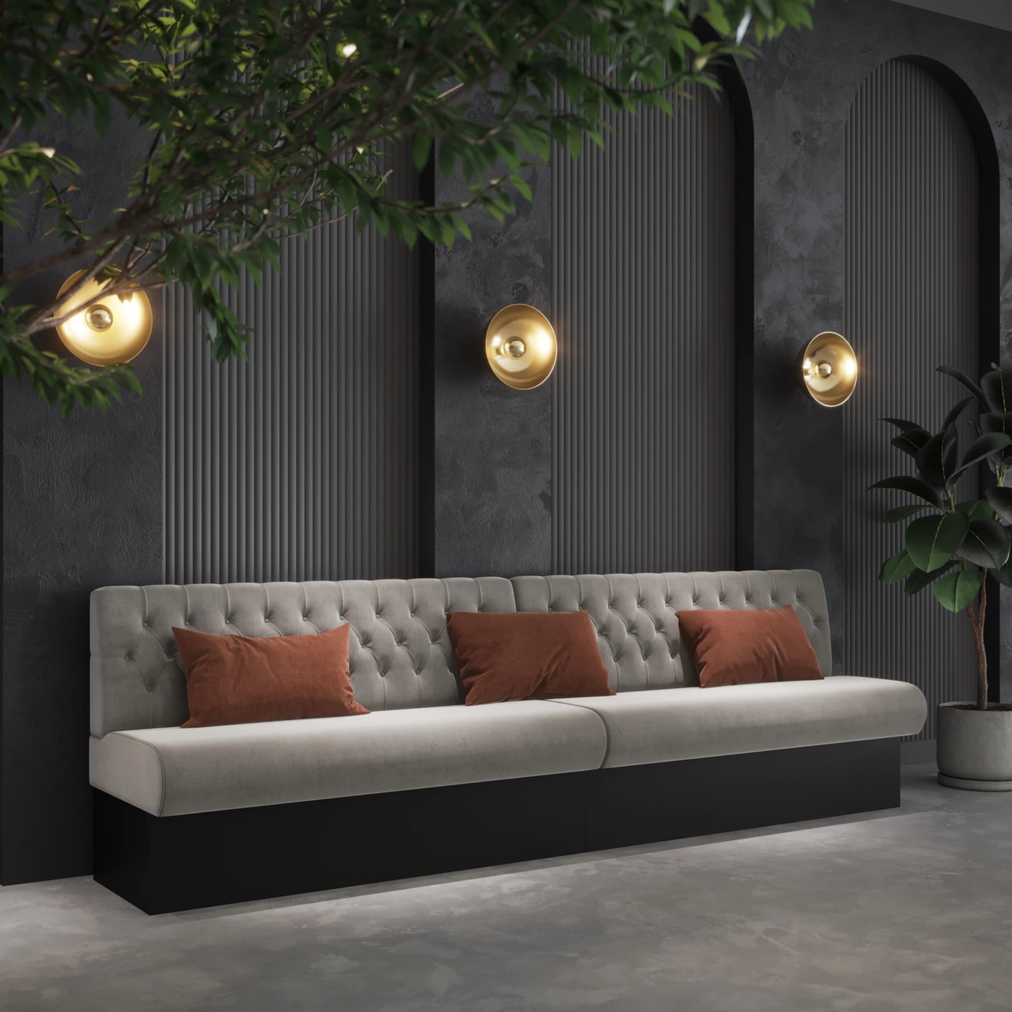 Donald Bench Capitons Foldings is a refined upholstered bench with capitons and elegant foldings on the backrest, reminiscent of the Chesterfield style. It features nosag springs and high-density foam for excellent comfort and durability. Available in a wide range of professional fabrics, it is a premium seating solution for any hospitality interior.