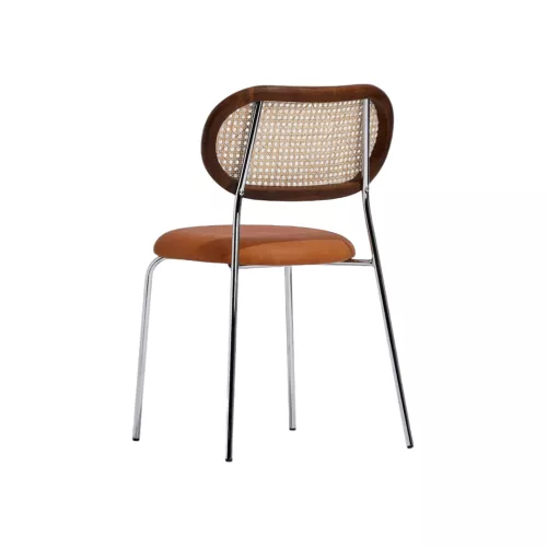 Fortune is a stylish metal chair with a strong steel frame, an upholstered seat available in a wide range of fabrics or faux leather, and a cane backrest that adds a touch of elegance. Its stackable design makes it ideal for flexible use in HoReCa settings or contemporary interiors seeking a blend of comfort and functionality.
