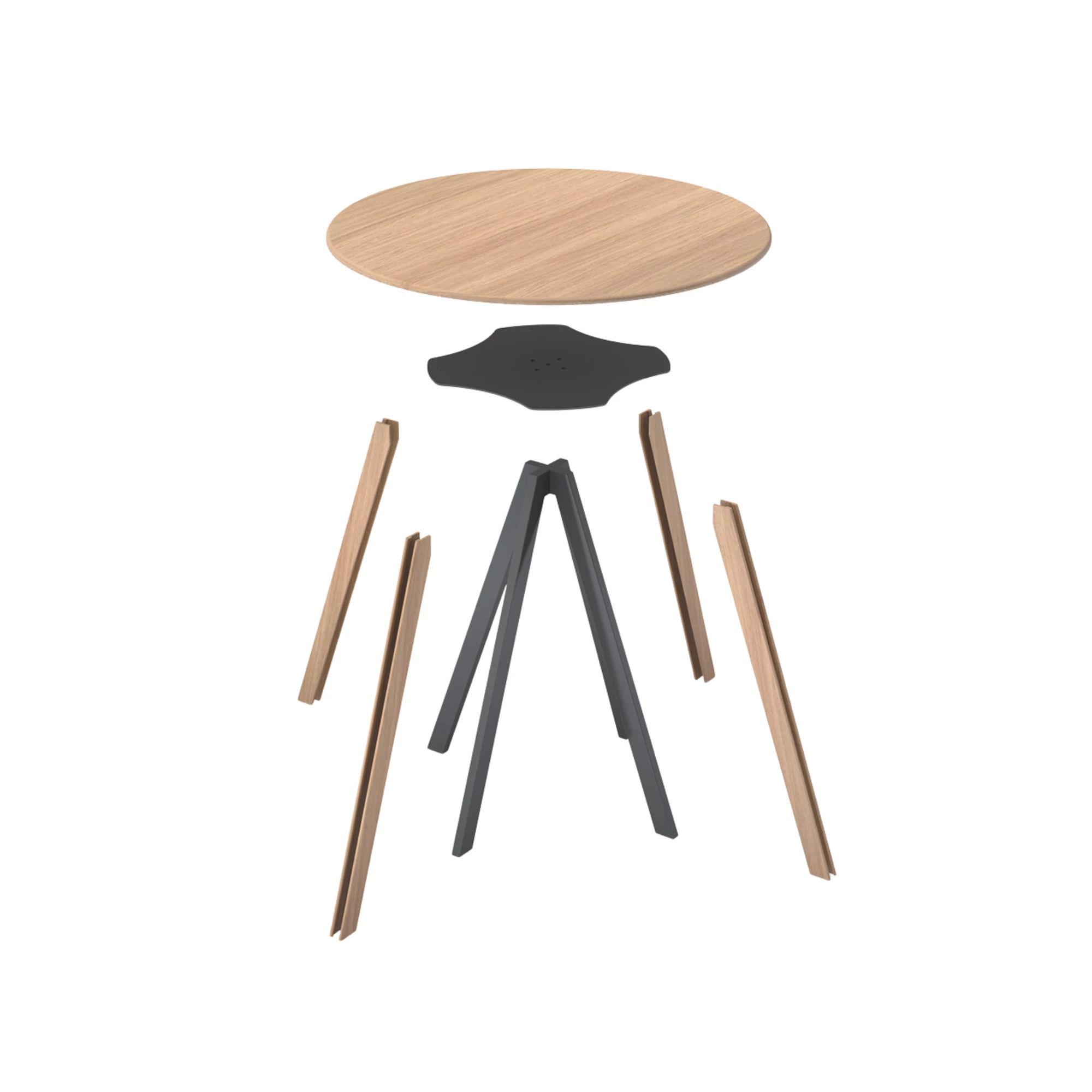 Jean W is a refined table base designed for horeca spaces, combining an iron core with a beech wood slat exterior in various finishes. It includes a steel cross and adjustable feet for stability. Delivered disassembled for easy transport. Compatible with tops up to 90x90 cm or ⌀100 cm. Ideal for diverse horeca interiors and design styles.