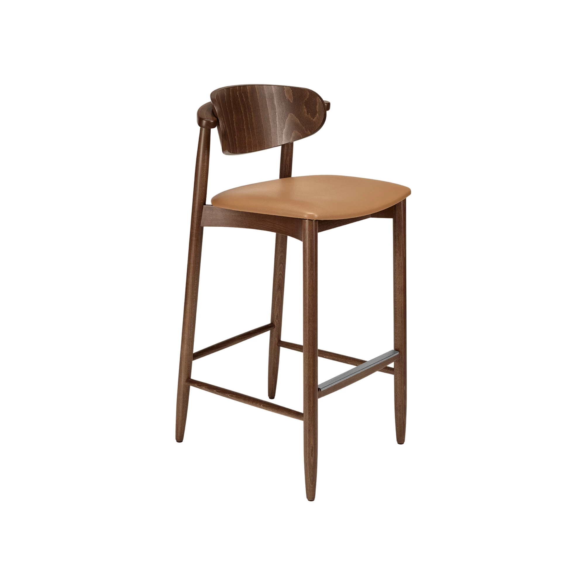 Elegant beech wood barstool with a refined upholstered seat that combines comfort and durability. The solid frame can be finished in a wide range of wood stain colours, allowing perfect harmony with any interior concept. Designed especially for Horeca environments, it ensures lasting performance even under intensive use. The seat can be upholstered in faux leather or in a wide selection of high-quality fabrics, offering both style and resilience.