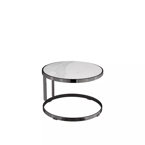 The Joint S coffee table stands out with its 35 cm height and compact ⌀50 cm top, ideal for horeca settings. Featuring a round steel base in multiple color finishes, it is available with a ceramic top or one upholstered in hide. Elegant and space-efficient, it integrates seamlessly into lounge areas, cafés, or hotel interiors with a refined atmosphere.