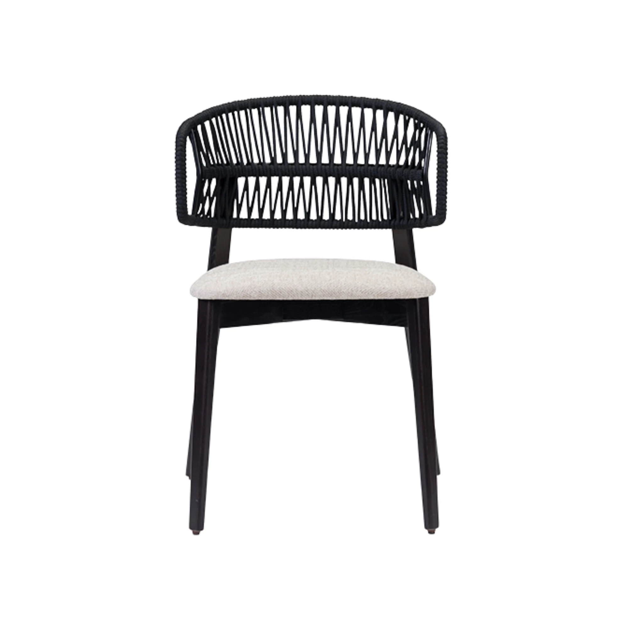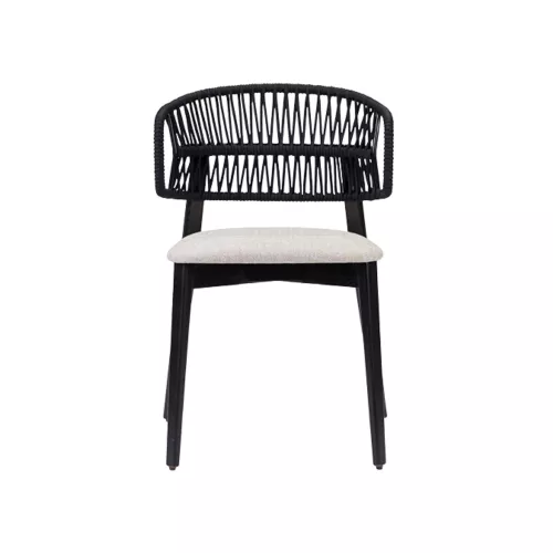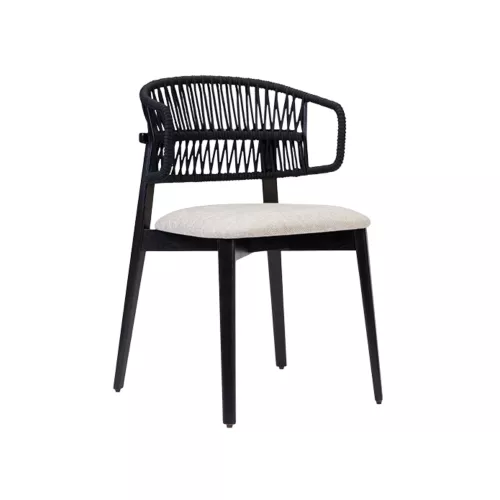 Nebulas is a modern chair with armrests made from durable ash wood. Its standout feature is a beautifully woven cord backrest that combines style and comfort. Designed for horeca venues like restaurants and coffee houses, it offers customizable wood finishes and upholstery colors. High-density foam padding on the seat ensures long-lasting comfort and durability.