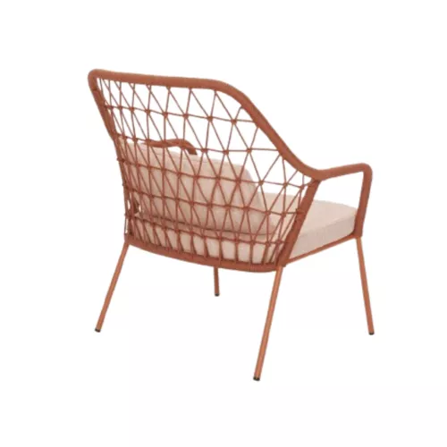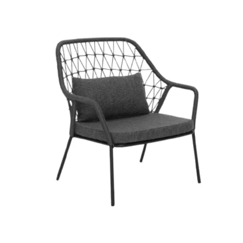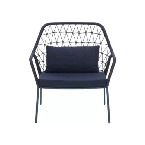 Panarea 3679 is a stylish lounge armchair with a hand-woven Italian polypropylene cord wrapping a durable Ø 20 mm steel frame. Its dry-feel polyurethane seat cushion, upholstered in matching yarn fabric, and supportive armrests make it perfect for indoor restaurants and elegant hospitality spaces.