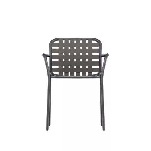 This outdoor collection combines innovative design with refined craftsmanship. Woven elastic straps are uniquely integrated into a sophisticated aluminium frame, resulting in a piece that offers both aesthetic appeal and exceptional comfort. Its eclectic style makes it a standout choice for any outdoor setting, from terraces to lounges.