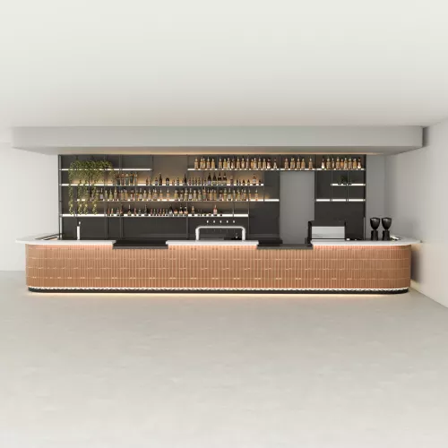 A refined contemporary bar concept designed with soft tones, elegant textures, and a gentle sense of warmth. The service top is crafted in a Carrara-coloured solid surface, offering a clean, luxurious marble-inspired aesthetic. Its calm white veining sets a serene, inviting mood from the very first glance.