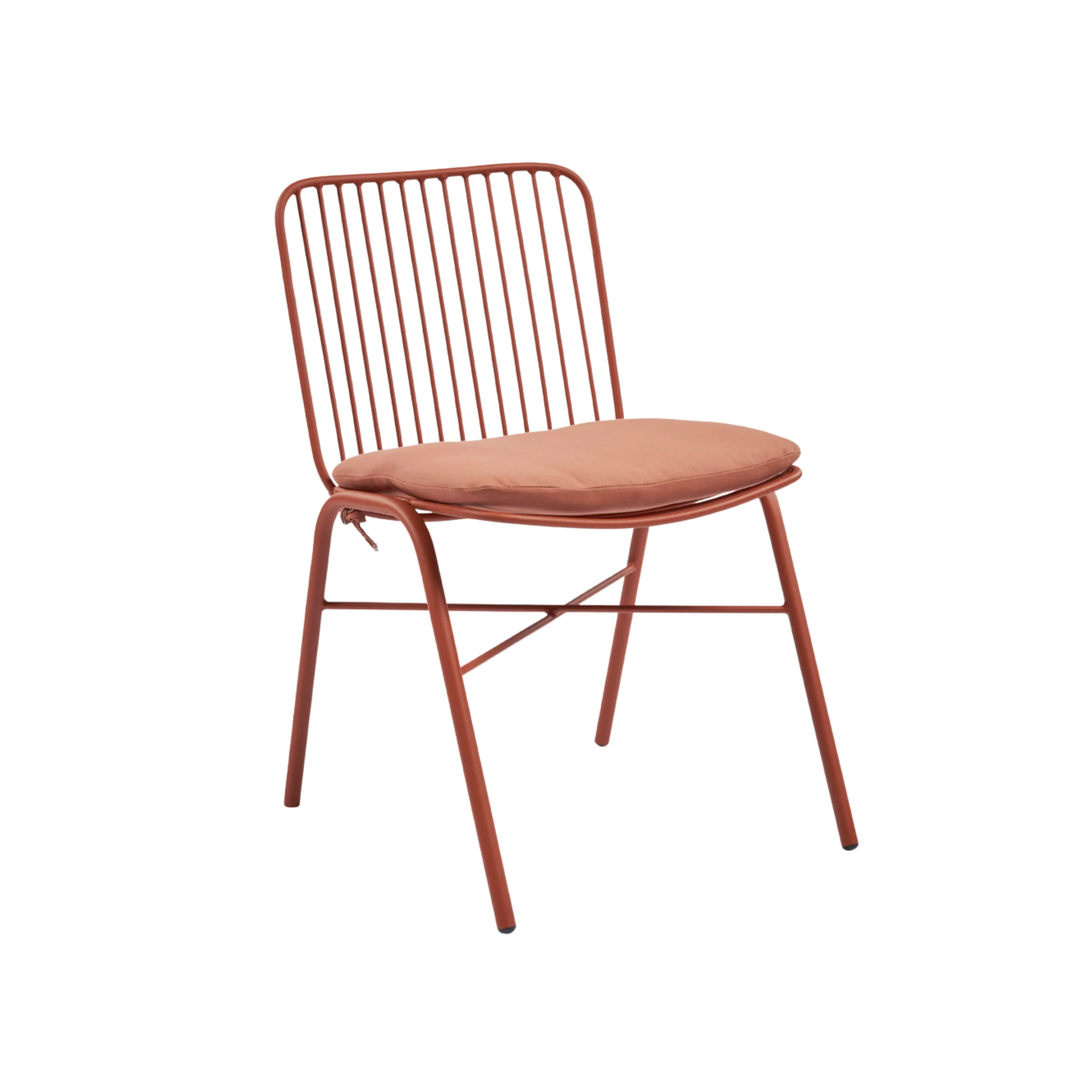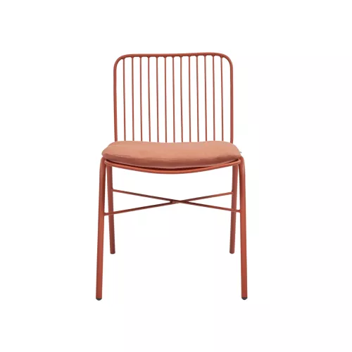 Outdoor chair with a metal frame and a comfortable seat cushion, designed for hospitality terraces and outdoor dining areas. The slender vertical lines of the backrest create a light and balanced appearance, while the sturdy metal structure ensures durability in intensive use environments. Suitable for cafés, restaurants, patios, and terrace seating areas where both comfort and practical design are required.