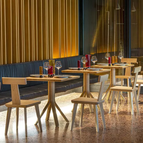 The Salzburg Chair, crafted from natural beech wood, combines clean lines with practical elegance. Available in black or lacquered finishes, its T-shaped backrest offers both support and easy mobility. With its timeless design and refined proportions, Salzburg adapts to various interior styles and is perfect for horeca or contract spaces.