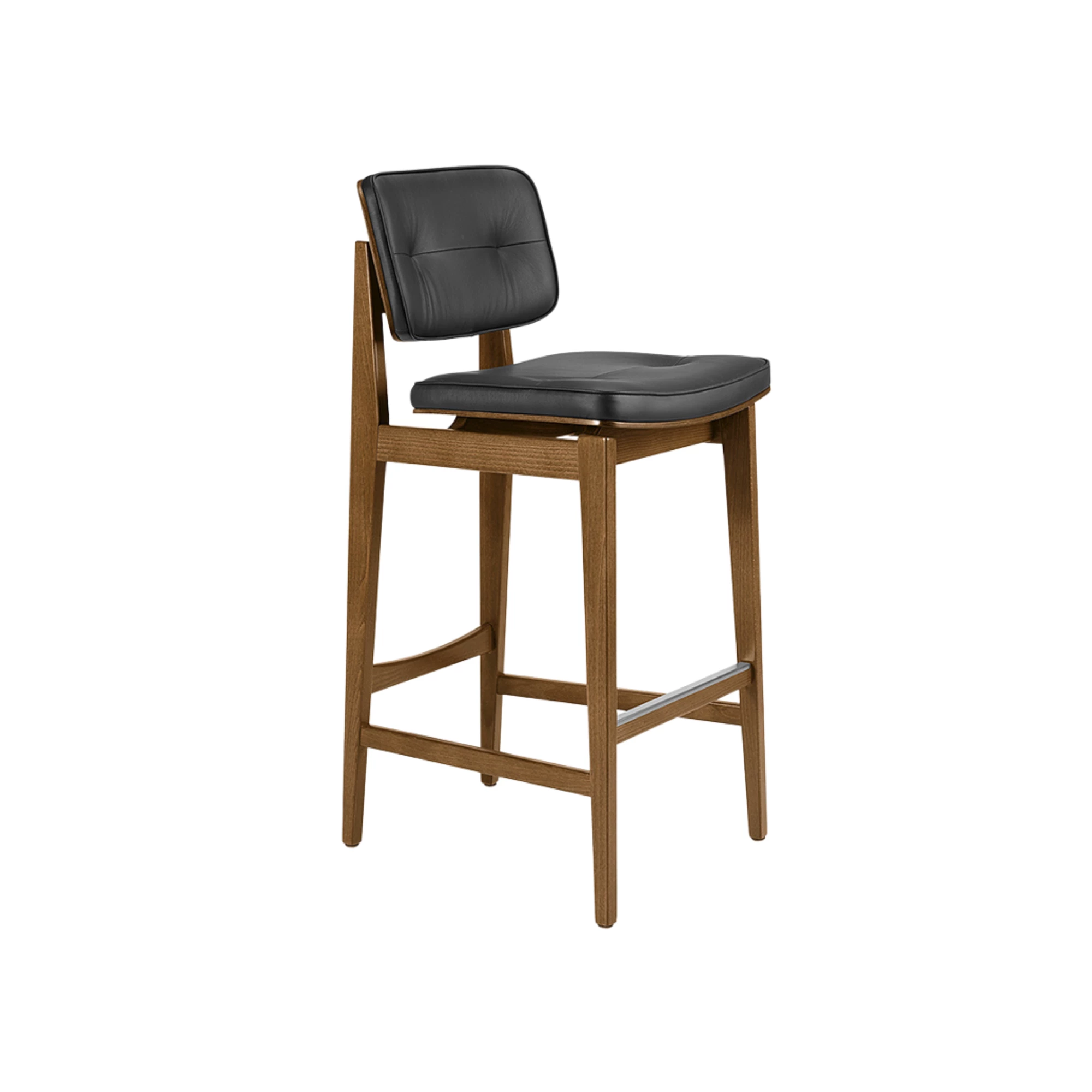 Elegant barstool crafted from durable beech wood, featuring an upholstered seat and backrest for superior comfort. The frame is available in a wide selection of wood stain finishes, allowing seamless coordination with any interior concept. Designed specifically for the Horeca industry, this barstool combines timeless aesthetics with exceptional durability. The upholstery can be customized in faux leather or a wide range of premium fabrics, ensuring long-lasting resistance even under heavy use — making it a reliable and stylish choice for bars, cafés, and restaurants.