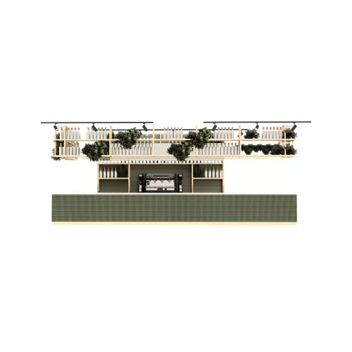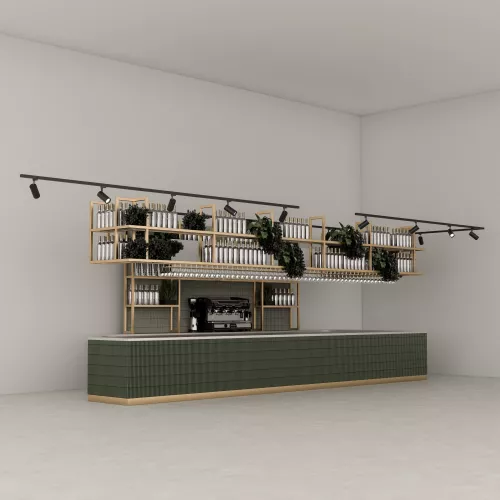 Above the counter, the hanging frame and backwall frame—crafted from 4x4 cm powder-coated metal in a gold finish—add a luxurious structural accent. Their geometric simplicity brings sophistication while gently framing the display area.
