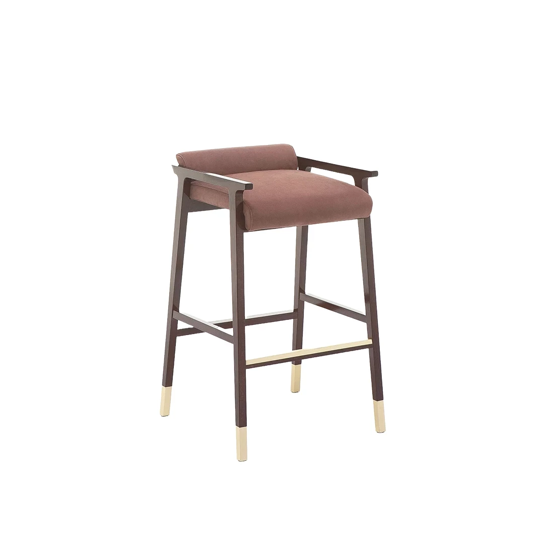 The Tenuo BK wooden barstool combines elegance and sophistication, inspired by 20th-century design masters. Crafted from solid beech wood with brass anodized stainless steel caps and footrest, it features an upholstered seat and backrest available in a wide range of professional fabrics. Perfect for hotels, bars, and horeca spaces.