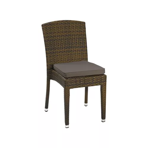 Titus Brown S is a stylish outdoor chair designed for horeca environments. Featuring a powdercoated aluminium frame and a flat P.E.-Wicker seat and backrest in a warm burned tone, it’s UV and weather resistant and stackable up to 8 pieces. Its durable build and timeless look suit a wide range of outdoor settings. An optional water-repellent seat cushion is also available.