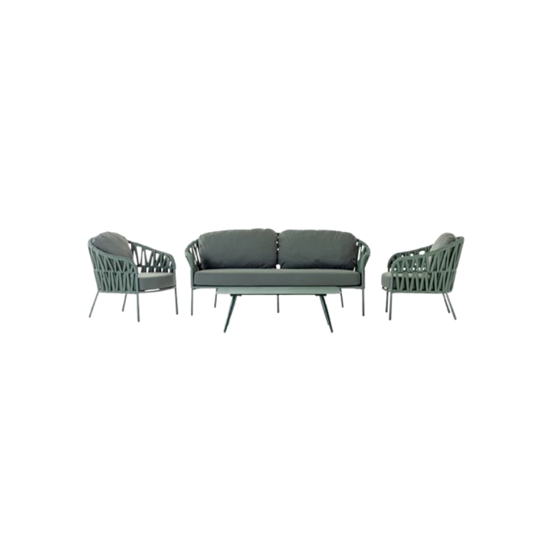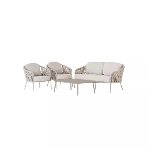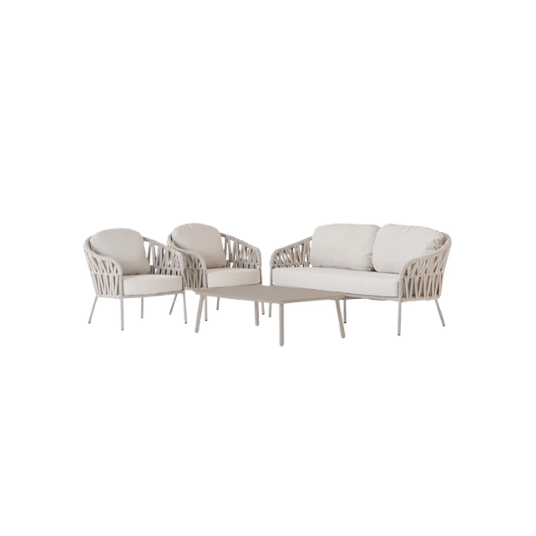 Upgrade your outdoor space with this stylish and durable living set, designed for both comfort and elegance. Crafted from high-quality aluminium and finished with polyester and rubber rope, it offers a modern look while ensuring long-lasting performance. The set includes one spacious sofa, two comfortable lounge chairs, and a sleek table with an aluminium top, making it perfect for relaxing or entertaining. The cushions are made from premium Olefin fabric with water-repellent properties, ideal for outdoor use in various weather conditions. As a bonus, the set also includes one Victory sand chair and one Atol armchair, providing additional seating and versatility. This is a complete set offered at a single price and cannot be purchased as individual items, making it a perfect all-in-one solution for your outdoor living space.