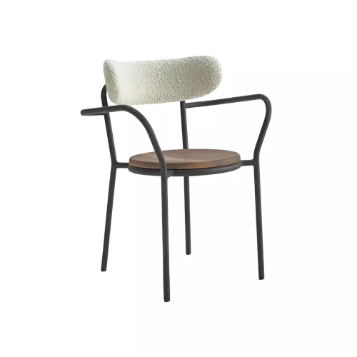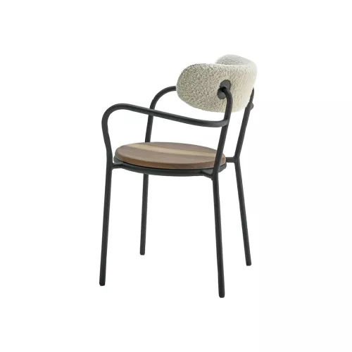 The Zoey chair features a fixed powder-coated metal structure with a Ø20x1.5 mm backrest tube. Its multilayered natural beechwood shell is available veneered in various woods or upholstered, with fireproof foam for added safety and comfort. Ideal for hospitality, office, or public spaces.