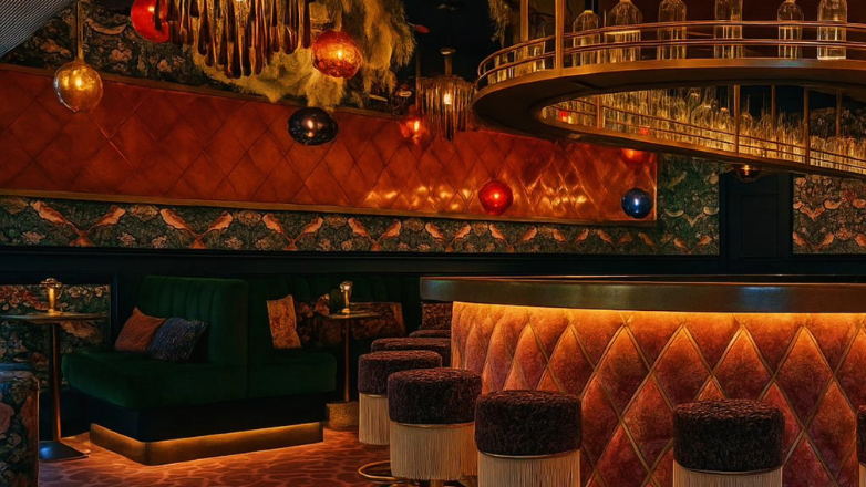 In the boutique wine and cocktail bar Nel Mezzo, a bordeaux-red giraffe-pattern carpet forms the basis for a bold interior with rounded shapes, playful patterns and a warm atmosphere.