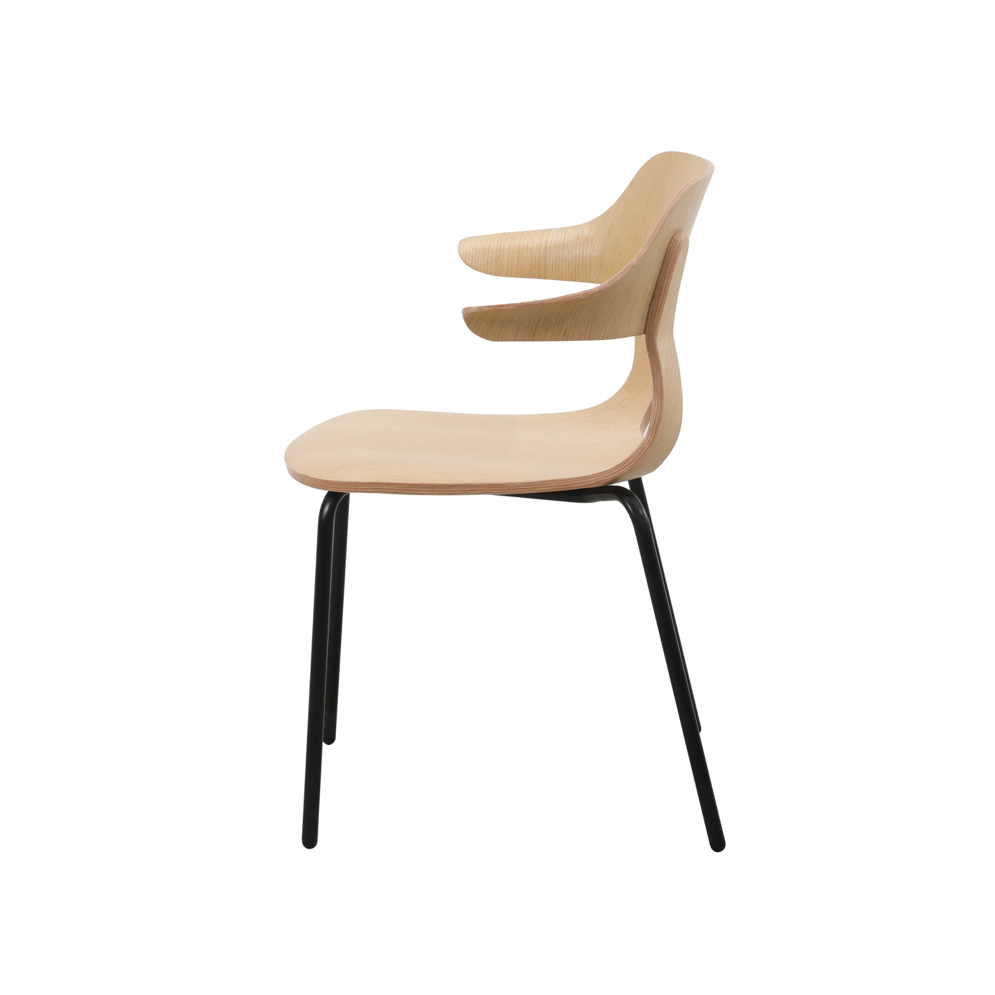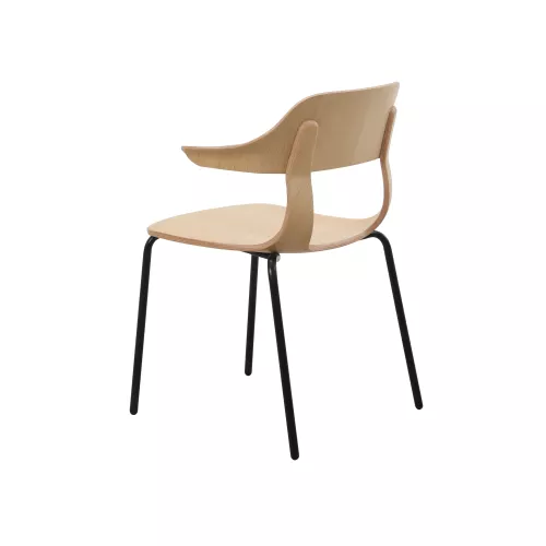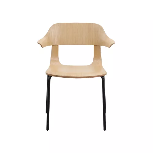 Elegant oak chair with flowing lines and open armrests, designed for visual lightness and everyday comfort. The gently curved shell is supported by four slim wooden or metal legs, offering a balanced look that fits seamlessly into modern HoReCa interiors.