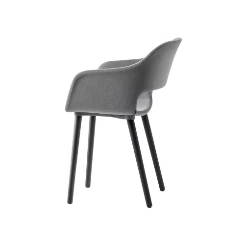 The polypropylene shell is padded with flexible polyurethane foam (density 60kg/m³), fire-retardant (class 1 IM, Crib 5), and covered with fabric. The aluminium frame is coated with a water-based, matte (5 gloss), scratch-resistant finish.