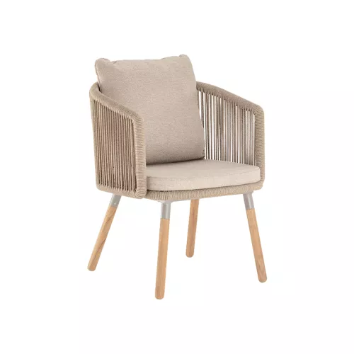 The Bahamas V is an elegant outdoor armchair featuring a sturdy Aluminium frame wrapped in polyester rope, complemented by teak legs for a natural touch. Its plush cushion, upholstered in durable acrylic fabric, offers comfort and UV resistance. Perfect for any outdoor horeca terrace and adaptable to various interior design styles.