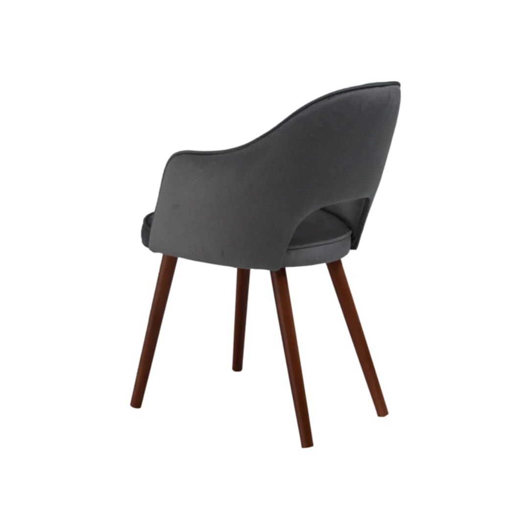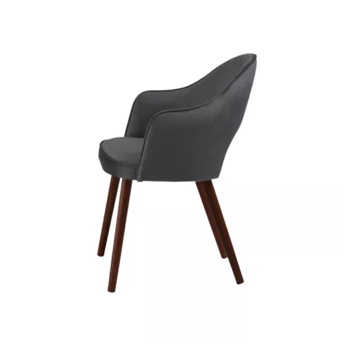 Bistra A Gap is a stylish upholstered chair with armrests and a distinctive cutout back, blending comfort with contemporary aesthetics. Crafted with sturdy beech wood legs, available in several stain options, and upholstered in durable fabrics or faux leather, it adapts easily to a variety of horeca spaces and interior styles.