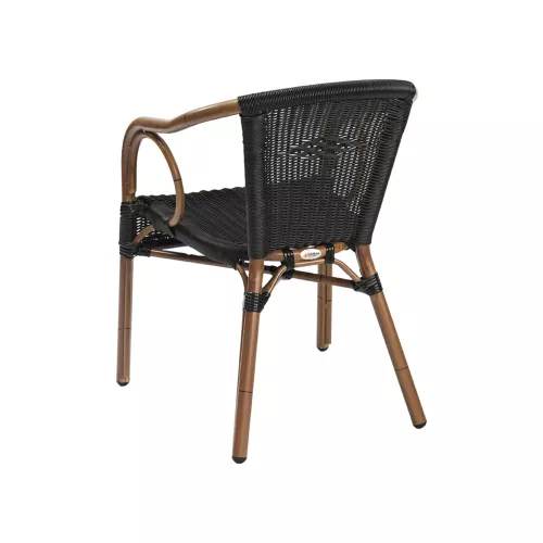 Corino is a stylish outdoor chair with armrests, featuring a powder-coated aluminium frame with a bamboo look. The seat and backrest are made of round P.E. wicker, available in black or honey. UV- and weather-resistant, Corino is built for durability in horeca settings. Stackable up to 8 pieces, it combines elegance, comfort, and space-saving functionality.