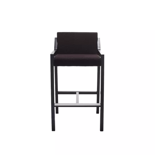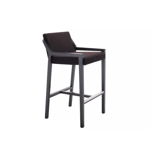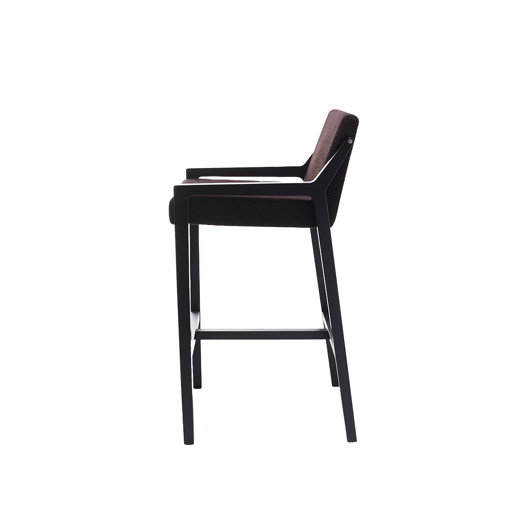 The Fred BK wooden barstool embodies the spirit of hospitality, blending comfort with refined design. Its soft upholstered seat and backrest, customizable in various fabrics or faux leather, rest on a solid beech wood frame with an aluminum footrest. The gentle lines of the shell contrast beautifully with the sturdy structure, creating a welcoming, timeless aesthetic.