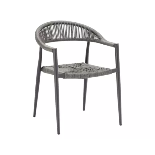 Outdoor chair made of Aluminium and rope weave, following the latest design trends. Stackable for easy storage and handling during off-season. Its shape and materials make it suitable for both indoor and outdoor use.