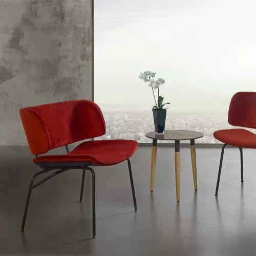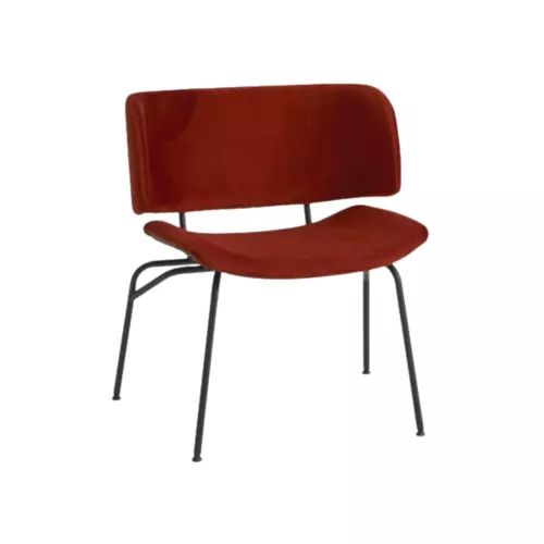 The July Lounge is a stylish lounge chair featuring a sleek metal frame and a curved, upholstered backrest for enhanced comfort. Its durable structure can be powder-coated in any RAL color, while the seat and backrest can be covered in a wide variety of fabrics or high-quality faux leather. Ideal for contemporary interiors.
