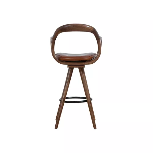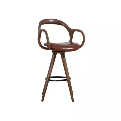 The Nelas BK barstool blends minimalist, natural design with comfort and durability. Its beech wood frame, available in multiple colors, features rounded wooden backrest and armrests, a metal footrest, and an upholstered seat. Ideal for bars, hotels, and diverse horeca spaces, with upholstery in professional fabrics or faux leather.