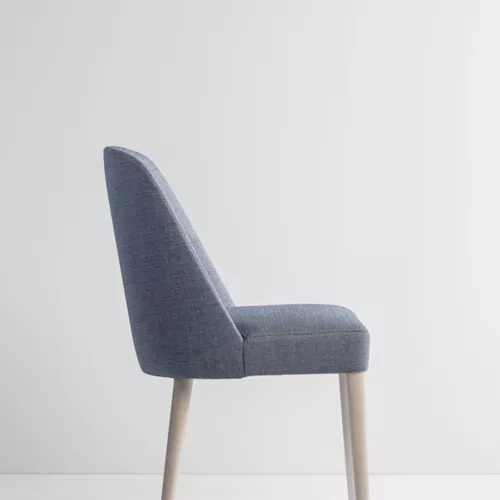 Nibirius LU S features smooth, flowing curves that invite comfort and style. Crafted from durable beechwood with multiple stain options, it boasts elegant golden caps on its legs. Upholstered in a wide range of professional fabrics or faux leather, this chair is designed to withstand heavy use, making it perfect for various horeca settings and interior designs.