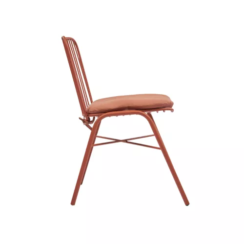 Outdoor chair with a metal frame and a comfortable seat cushion, designed for hospitality terraces and outdoor dining areas. The slender vertical lines of the backrest create a light and balanced appearance, while the sturdy metal structure ensures durability in intensive use environments. Suitable for cafés, restaurants, patios, and terrace seating areas where both comfort and practical design are required.