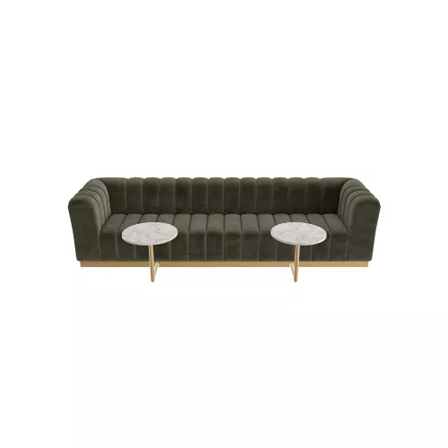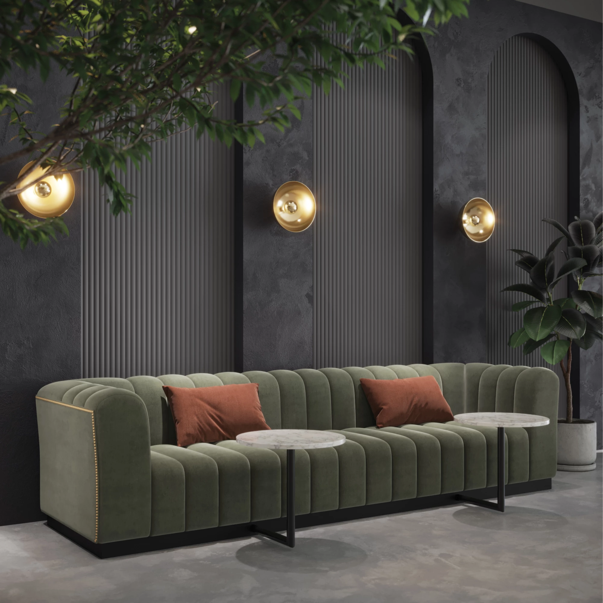 The Roll Bench is a custom-made dining bench featuring two 210 mm armrests on each side. It is crafted with a black-stained oak veneer sockle and a polished brass plinth in HPL 874 Satinata, including on the back. Available with or without brass tubes for tabletop connection, it offers high-quality foam, reinforced corners, and Nosag springs for superior comfort. Upholstered in velour, including the backrest, and finished with antique brass nails, the bench blends elegance with durability.