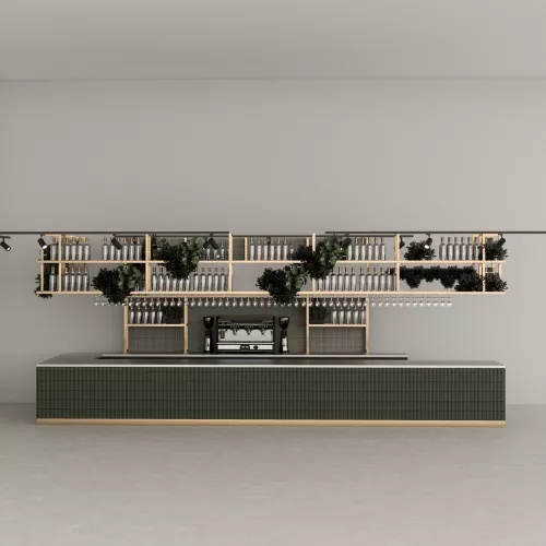 The front side is finished with glossy green glazed porcelain tiles in a refined Kitkat shape, paired with a cement-coloured joint that enhances the vertical rhythm and adds a crisp architectural structure. Below, a brushed brass HPL plinth introduces warmth and a subtle shimmer, lifting the design visually and giving the bar an elegant floating presence.