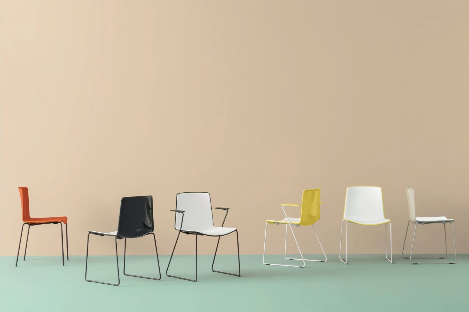 The Tweet collection offers a range of seating solutions that blend a rational, clean design with a wide variety of frames and finishes, ensuring maximum adaptability for both contract and domestic settings. The Tweet Soft armchair is stackable and features an upholstered shell in fabric or simil leather, supported by a sturdy Ø14 mm steel tube frame. The frame is available in chromed or powder-coated steel, with a durable polypropylene shell for added comfort and longevity.