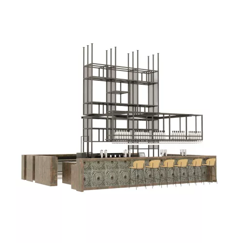 A bar designed for modern hospitality spaces, merging warmth, metallic sophistication, and architectural style into a refined centerpiece.